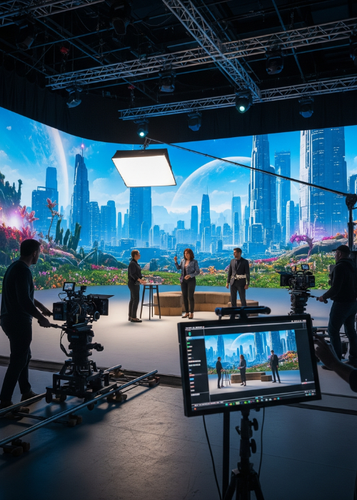 Real-time AI-generated virtual environments used instead of traditional green screens, offering actors and directors dynamic backdrops during shoots
